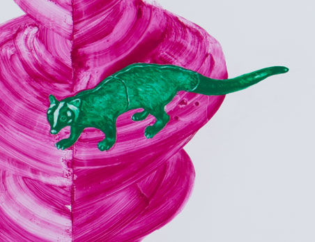 Yoshizawa Mika exhibited on the theme of three factors of "war, honor, profit, fear" in the previous show,2015. This time, she painted the new works composed of animals as a motif with her original dynamic forms. The title "Empathy " comes from an episode where the son of a terrorist went beyond hatred and aimed at a peaceful world by empathy for others' pain.