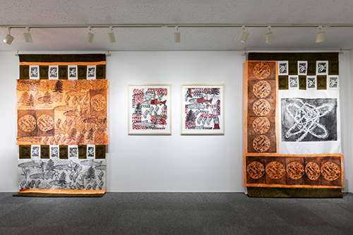 Shoko Otake has developed a distinctive approach to printmaking, combining woodblock printing on paper or cloth with the frottage technique. She employs the use of small woodblocks on a repeated basis, resulting in the creation of simple and complex images. In 2024, the artist created and exhibited new works on commission from fashion brands such as The North Face Purple Label and Maison Margiela.