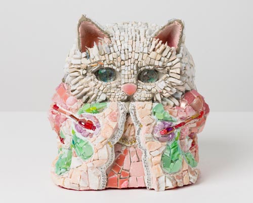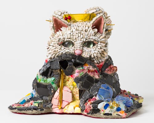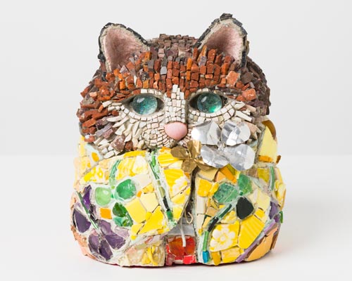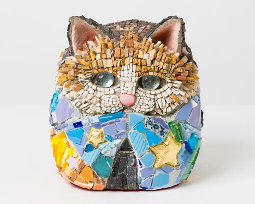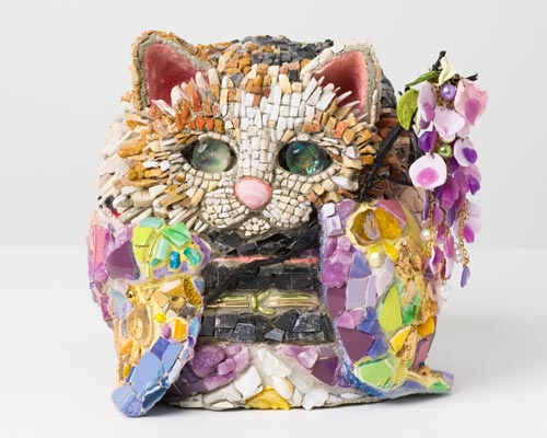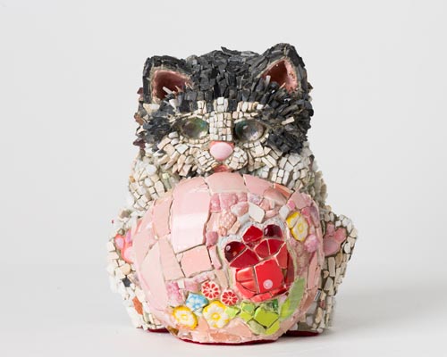 芸大油画科壁画専攻で博士を修了、 モザイクで立体を作る異色の人気作家、西ノ宮佳代(にしのみやかよ)の個展を開催。古代からの伝統的な技法を学び立体化したのは彼女独自の手法です。モチーフをよりリアルに見せるため大理石だけでなく貝がらや陶片、ボタンなど多彩な素材を使用し、生き生きした立体を創作。 猫を愛し、共に暮らす西ノ宮佳代の作る「猫だるま」は予約がないと買えないほどの人気。実在の猫をモデルに制作した等身大の「アトム&プラム」像に加え、最新作「瑞祥ー白孔雀」も展示。